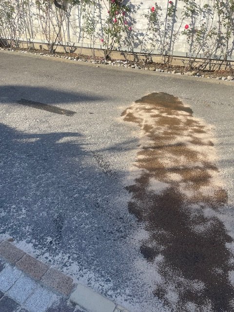Verunreinigung der Strasse durch ausgelaufene Flüssigkeit eines Fahrzeugs.
